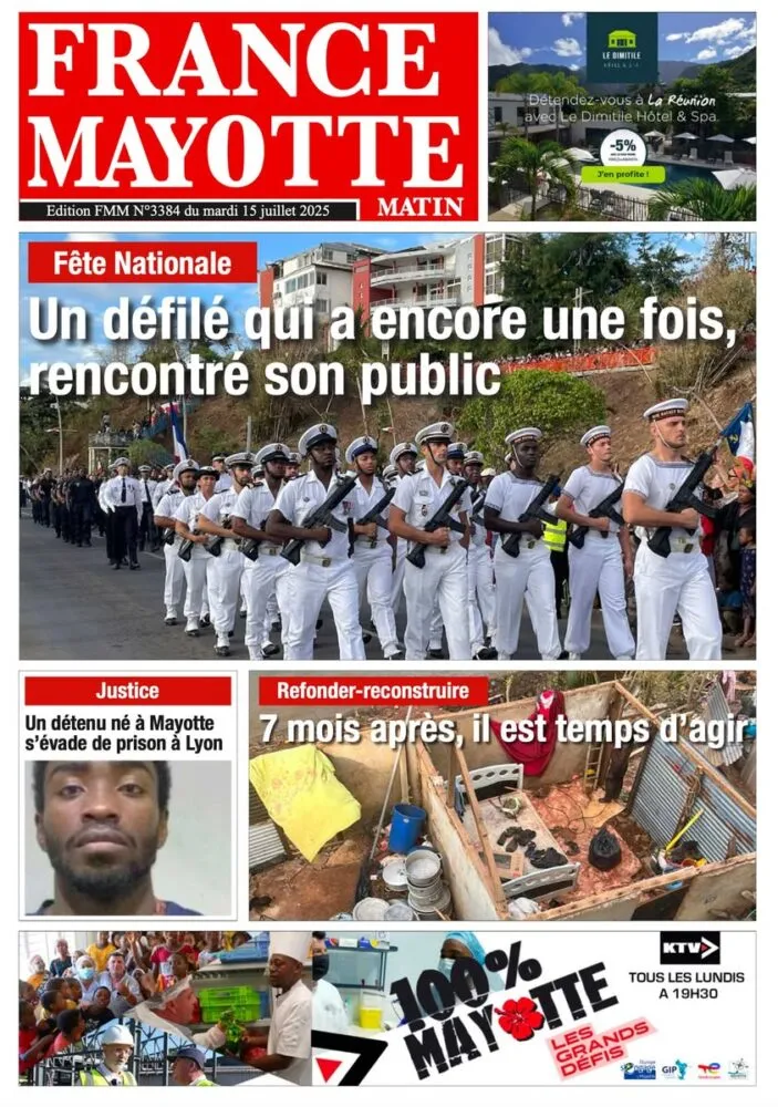 À Mayotte, le quotidien France Mayotte Matin met en avant le succès populaire du défilé du 14 juillet. L’événement, rassemblant civils et militaires, a su mobiliser les foules, dans un contexte de reconstruction sociale encore sensible. Le journal revient également sur l’évasion à Lyon d’un détenu originaire de l’île et pointe l’urgence d’agir, sept mois après les ravages causés par les violences dans certains quartiers.