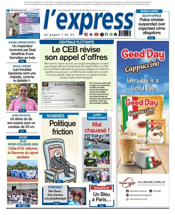 Enfin, à l’île Maurice, L’Express (Maurice) titre sur la révision de l’appel d’offres du CEB (Central Electricity Board) pour sa centrale flottante, projet controversé dans l’île. Le journal revient aussi sur les tensions politiques entre députés, les actes de violence juvénile, et les espoirs sportifs autour des Jeux inter-collèges.