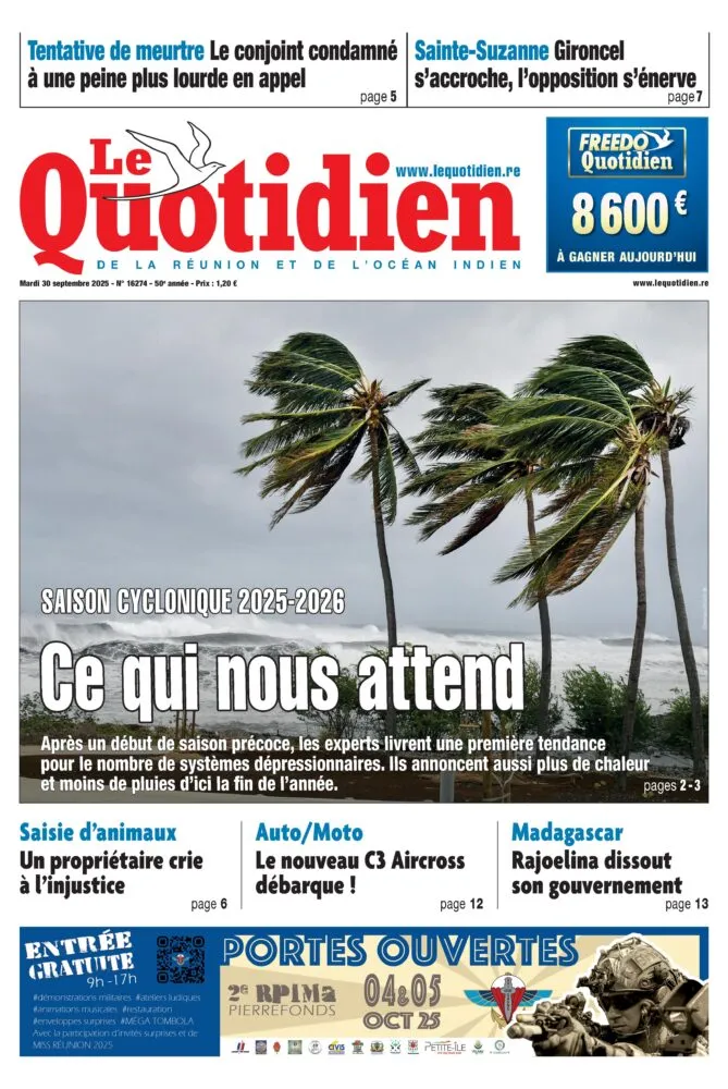 À La Réunion, l’heure est aux prévisions météorologiques. Le Quotidien place en Une la saison cyclonique 2025-2026. Après un début précoce, les spécialistes annoncent une activité dépressionnaire soutenue, avec davantage de chaleur et une baisse relative des précipitations en fin d’année. Une perspective qui inquiète dans un territoire déjà marqué par les effets du changement climatique. En parallèle, la chronique judiciaire et politique reste animée : à Sainte-Suzanne, le maire Gironcel, fragilisé par une condamnation, refuse de céder ses mandats, attisant la colère de l’opposition. L’actualité locale met aussi en lumière la saisie d’animaux par les autorités et la mise en vente d’un nouveau modèle automobile qui fait son entrée sur l’île.