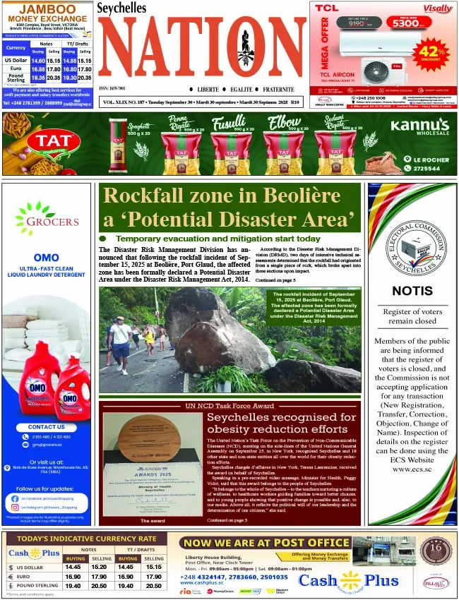Aux Seychelles, le Nation met en lumière une menace naturelle directe : la zone de Beoliere a été classée « à haut risque » après un glissement de rochers. Une évacuation temporaire et des mesures de mitigation sont enclenchées. Dans un autre registre, le pays se voit salué par l’ONU pour ses efforts en matière de réduction de l’obésité, preuve de la reconnaissance internationale pour ses politiques de santé publique.