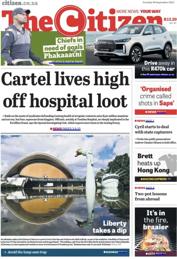 En Afrique du Sud enfin, The Citizen consacre sa Une à un scandale massif : un cartel aurait détourné des centaines de millions de rands via des contrats frauduleux liés au système de santé public. Villas de luxe et voitures de prestige ont été saisies lors d’une vaste opération. L’affaire illustre l’ampleur du crime organisé dans le pays et sa collusion avec certains réseaux institutionnels. Cyril Ramaphosa, fragilisé par la contestation interne, tente de réagir en renforçant les enquêtes sur la corruption d’État.