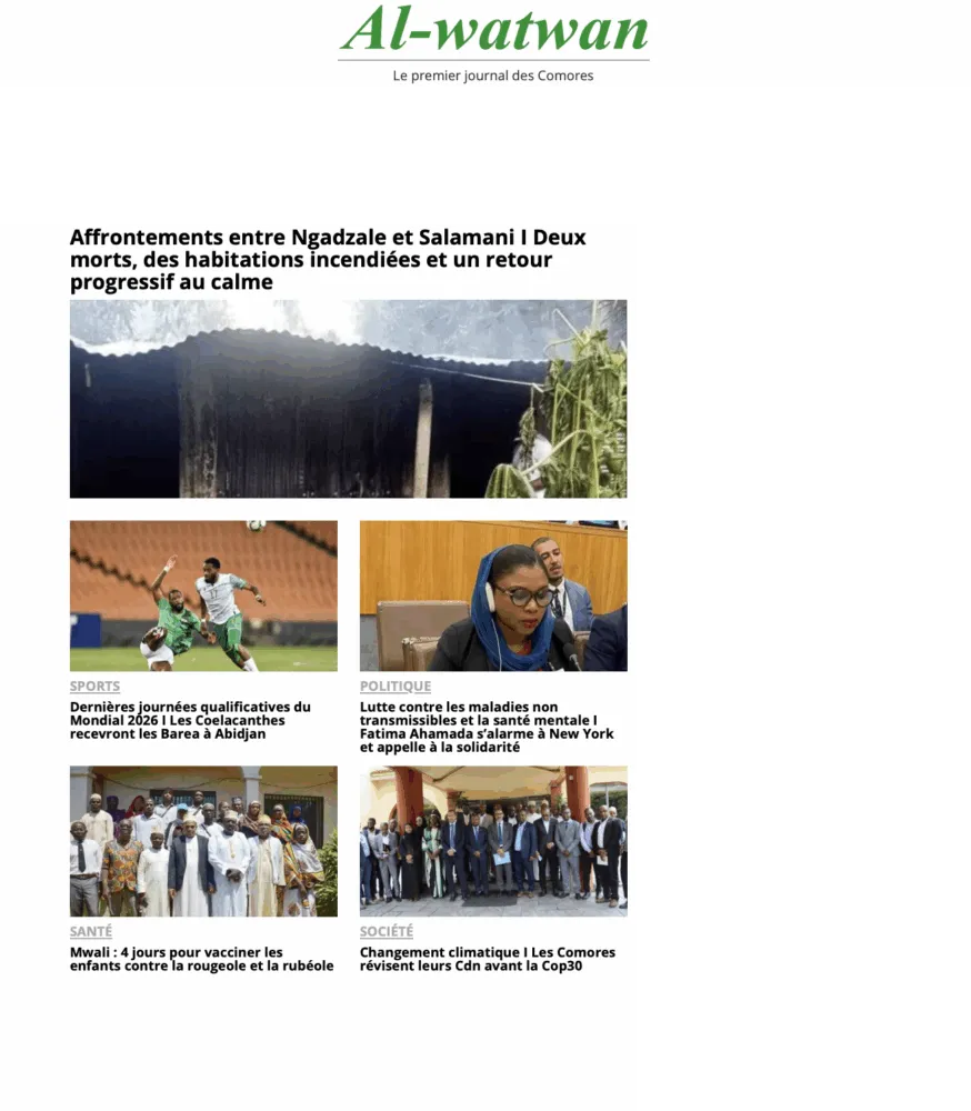 Aux Comores, Al-watwan fait état d’affrontements meurtriers entre les villages de Ngadzale et Salamani. Deux personnes ont perdu la vie et plusieurs habitations ont été incendiées avant que le calme ne revienne progressivement. Par ailleurs, la ministre Fatima Ahamada, en déplacement à New York, alerte sur les maladies non transmissibles et la santé mentale, plaidant pour la solidarité internationale. Les Comores se préparent également à réviser leurs engagements climatiques (CDN) avant la COP30, soulignant leur vulnérabilité face aux dérèglements climatiques.