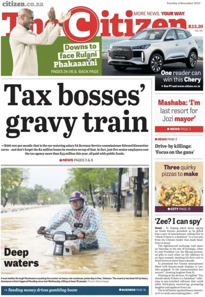 Le journal dénonce les salaires jugés « exorbitants » de hauts responsables du South African Revenue Service : plus de R33 millions versés à cinq dirigeants cette année.