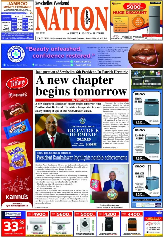 Seychelles Weekend célèbre l’inauguration du 6e président des Seychelles, Dr. Patrick Herminie, marquant un « nouveau chapitre » dès demain à 6 pm au Stade Linité, Roche Caïman. Le président sortant Wavel Ramkalawan met en avant les avancées notables de son mandat, dont des réformes électorales et des progrès en santé et éducation, lors d’un discours final devant la nation (photo : Office of the President). L’événement inclut une cérémonie avec la Première Dame et des dignitaires, soulignant l’unité et les défis futurs.