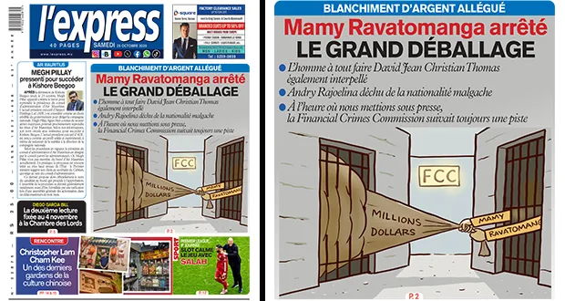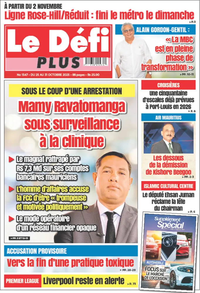 Le Défi Plus et l’Express Maurice dominent avec l’affaire Mamy Ravatomanga, magnat des affaires sous surveillance à la clinique suite à une arrestation. Le Défi Plus détaille le mode opératoire d’un réseau financier opaque. Autres faits marquants : fin du métro le dimanche sur la ligne Rose-Hill/Rédutie à partir du 2 novembre. L’Expresse ajoute que l’enquête porte sur des transferts suspects de plusieurs millions de dollars (estimés à plus de 20 milliards de roupies) depuis Madagascar vers Maurice, potentiellement liés à des fonds publics ou privés, avec des accusations sous les sections 36 et 38 du FCC Act. L’Express Maurice révèle également que, l’ancien président de Madagascar, Andry Rajoelina est déchu de la nationalité malgache.