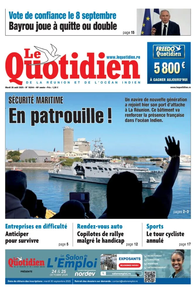 À Mayotte, France Mayotte Matin titre sur la cacophonie qui entoure le mouvement social lié à la barge, moyen de transport vital entre Petite-Terre et Grande-Terre. Grève ou pas grève ? L’incertitude demeure, au détriment des usagers. Le journal s’interroge aussi sur la rentrée scolaire : les infrastructures permettront-elles d’accueillir tous les élèves ?