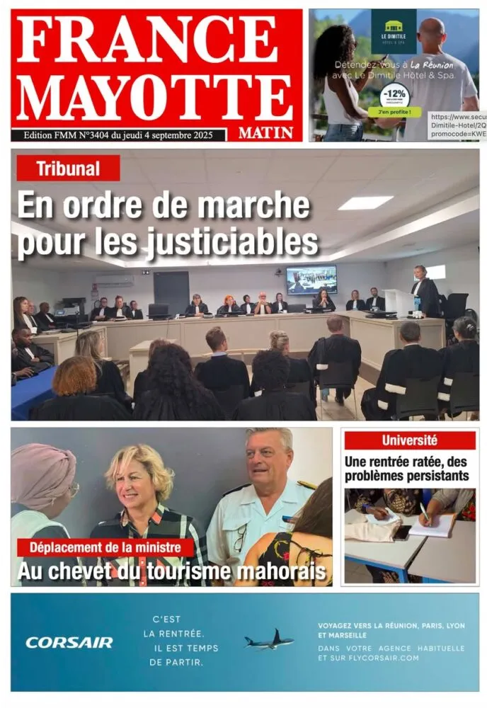 Le journal titre sur la justice avec « En ordre de marche pour les justiciables », illustrant la rentrée judiciaire. Côté politique et économie locale, la visite d’une ministre met en avant le soutien au secteur touristique mahorais, en difficulté. En parallèle, l’université de Mayotte connaît toujours une rentrée compliquée, marquée par des problèmes persistants d’organisation et de moyens.