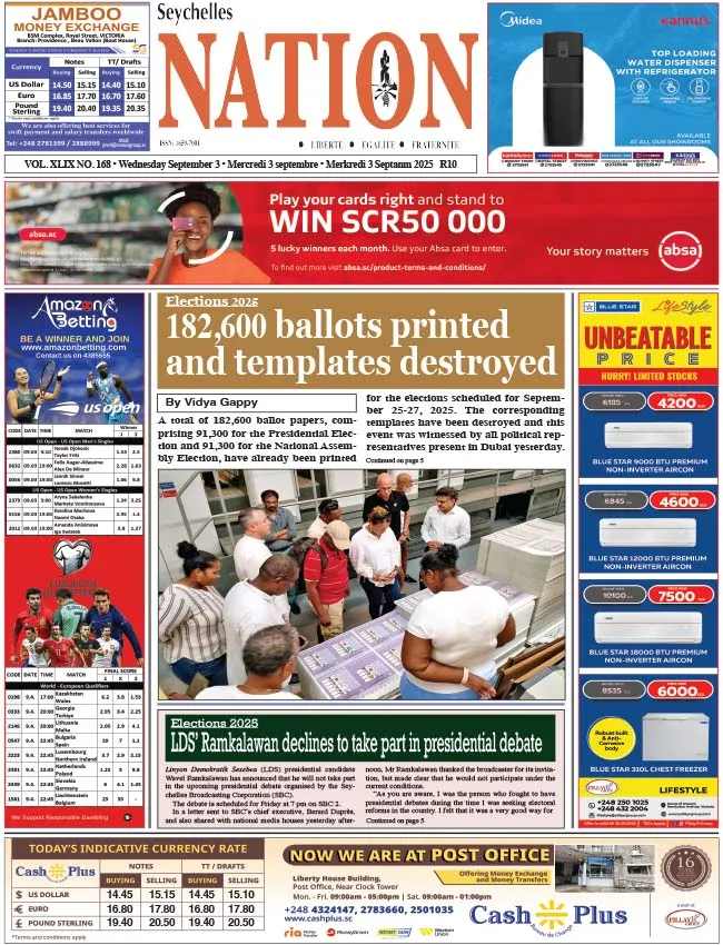 Le quotidien seychellois Nation revient sur l’échéance électorale de septembre : 182 600 bulletins ont été imprimés, les modèles détruits, et la transparence du processus est mise en avant. Dans le même registre, le président Wavel Ramkalawan (LDS) a annoncé qu’il ne participera pas au débat présidentiel, un choix politique qui suscite des réactions. Le suivi du processus électoral reste au centre de l’actualité.