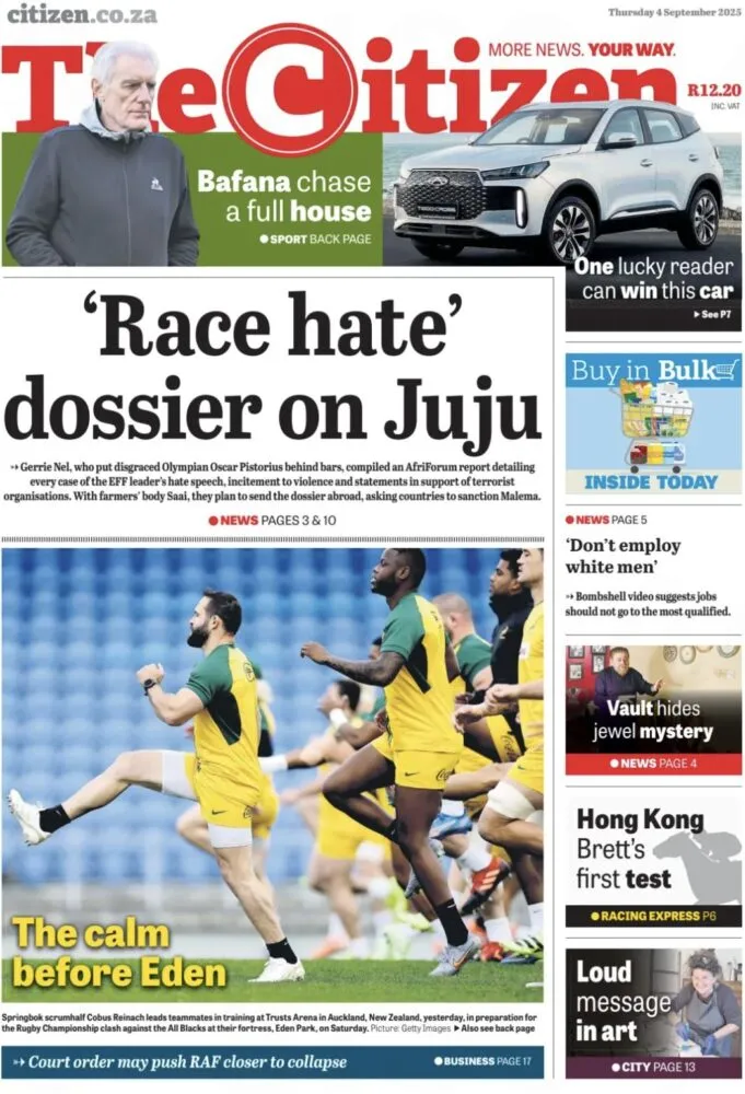 En Afrique du Sud, The Citizen consacre sa Une à un rapport explosif d’AfriForum sur Julius Malema, leader des EFF, accusé de discours de haine raciale et d’incitation à la violence. L’affaire, qualifiée de « dossier race hate », devrait avoir un impact politique et judiciaire. En sport, l’accent est mis sur les préparatifs des Springboks avant leur match face aux All Blacks, avec Cobus Reinach en avant-plan. L’actualité est donc dominée par la politique nationale et le rugby, sport emblématique du pays.