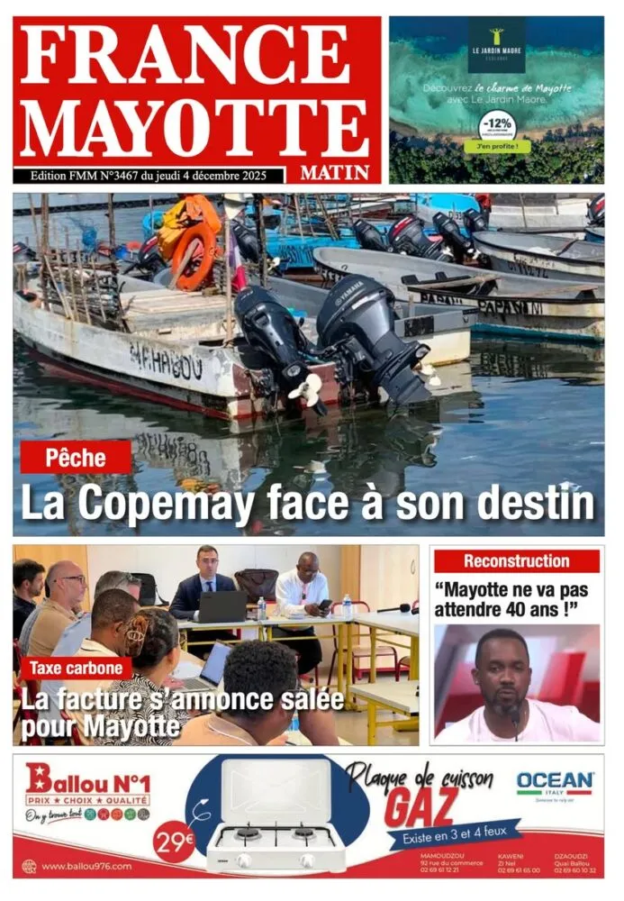 France Mayotte titre sur la Copemay, au cœur d’incertitudes pour son avenir, alors que le secteur de la pêche est fragilisé. Le quotidien évoque aussi une facture salée liée à la taxe carbone, qui risque d’alourdir significativement les coûts de fonctionnement dans le département.