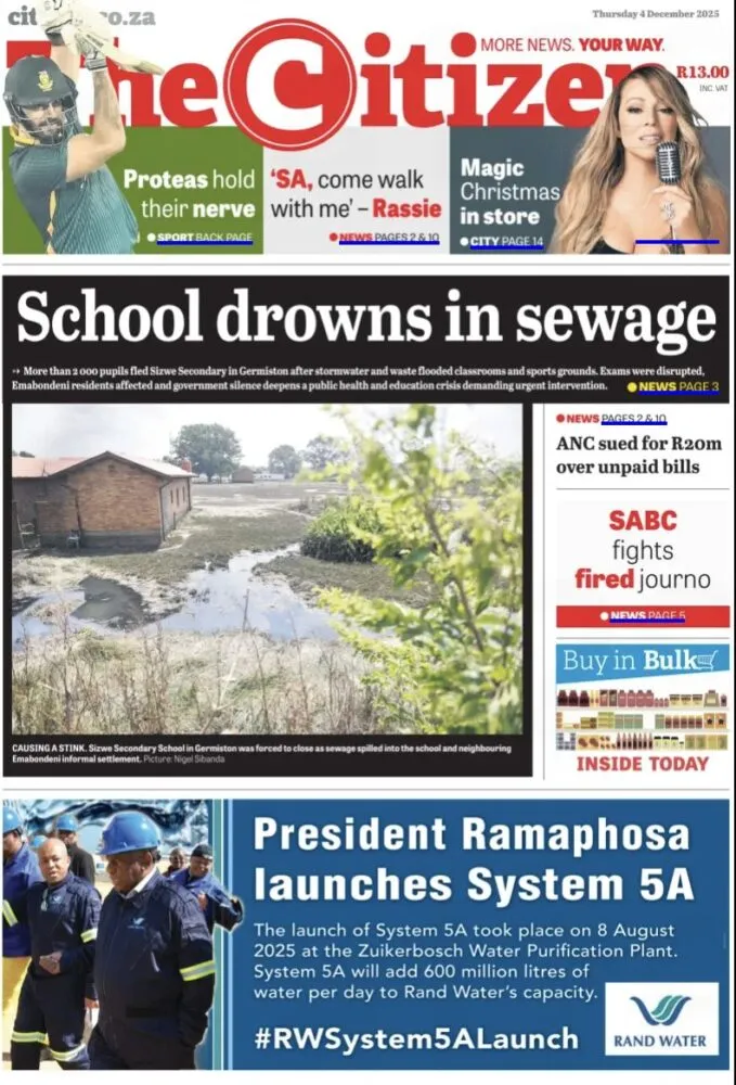 The Citizen ouvre sur un scandale sanitaire et éducatif : une école de Germiston inondée par des eaux usées, forçant plus de 2 000 élèves à fuir les lieux. L’incident provoque une forte indignation et relance les critiques sur l’état des infrastructures publiques.