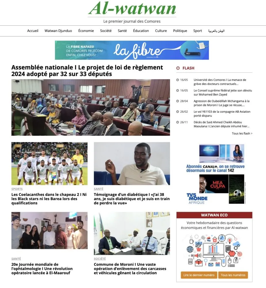 Al-watwan met en avant un sujet politique majeur : l’adoption du projet de loi de règlement 2024 par 32 députés sur 33, confirmant la stabilité de la majorité parlementaire. Le journal couvre aussi plusieurs initiatives locales, comme une vaste opération d’enlèvement de carcasses de véhicules gênant la circulation à Moroni.