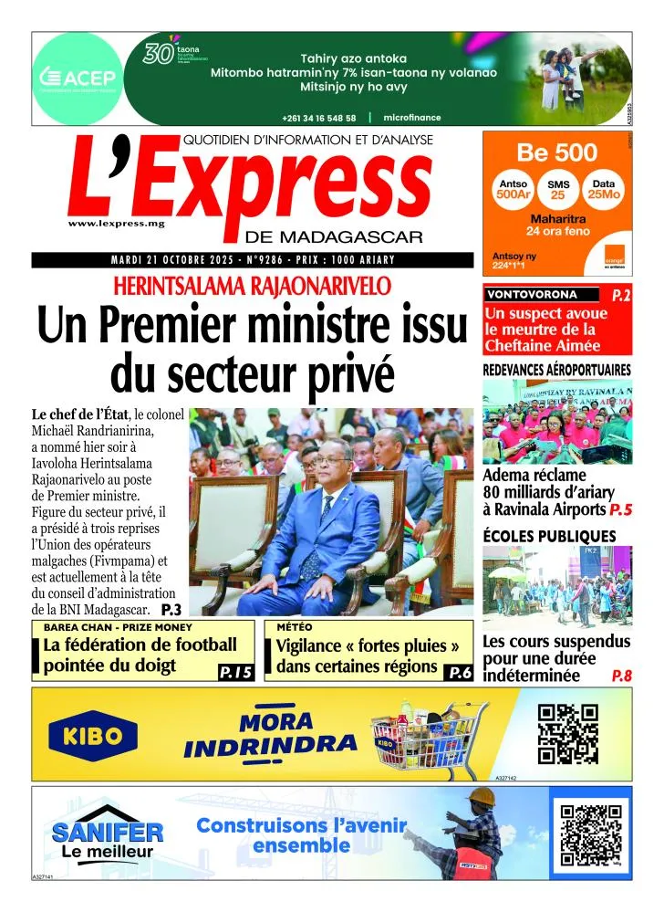 À Antananarivo, L’Express de Madagascar annonce la nomination d’un Premier ministre issu du secteur privé, Herintsalama Rajaonarivelo. Le colonel Randrianirina, chef de l’État, entend placer la compétence économique au cœur de la refondation nationale. L’ancien président de la Fivmpama, habitué du monde des affaires, incarne cette volonté d’efficacité. Mais le pays reste sous vigilance : des pluies intenses menacent plusieurs régions, les écoles publiques suspendent leurs cours, et la fédération de football est critiquée pour sa gestion des primes des Barea.