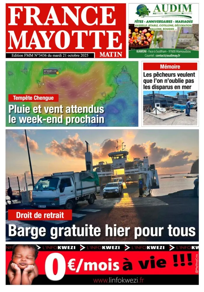 France Mayotte Matin place l’île sous surveillance : la tempête tropicale Chenge devrait apporter pluie et vent dès le week-end. La barge reliant Petite-Terre à Grande-Terre a été gratuite hier, conséquence du droit de retrait des agents face à des conditions de travail jugées dangereuses. Enfin, le journal met en avant la mémoire des disparus en mer, portée par les pêcheurs qui refusent l’oubli et réclament un hommage durable à leurs collègues perdus.