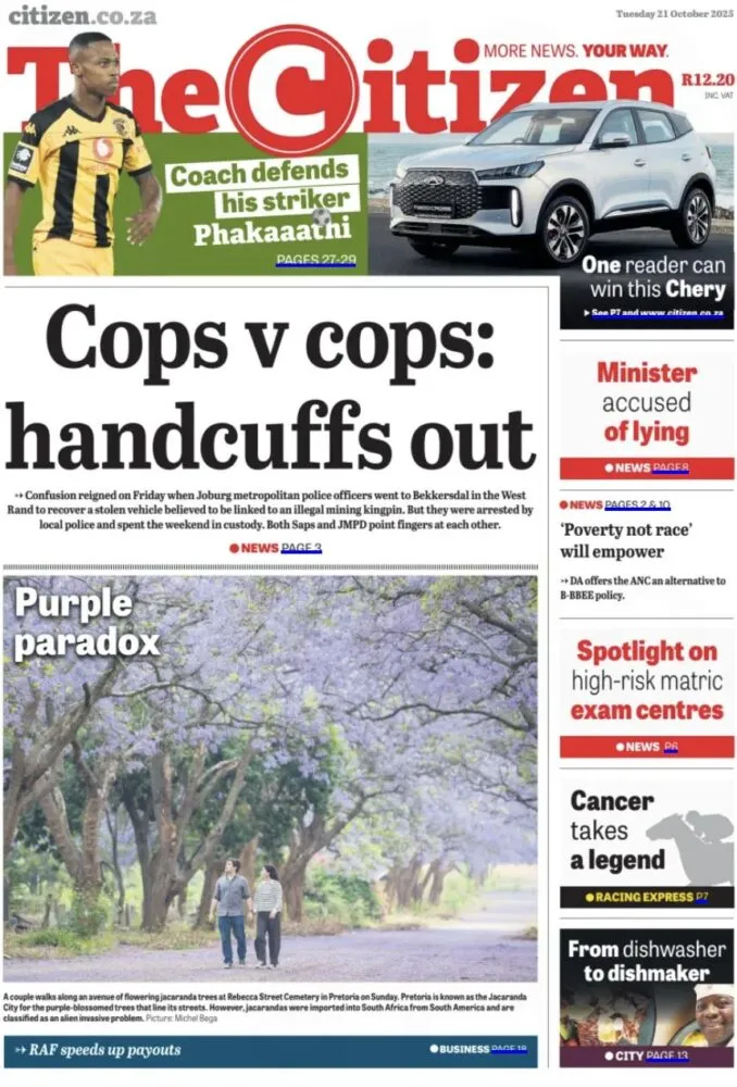 The Citizen dévoile un scandale inédit : “Cops v cops – handcuffs out”. Des policiers métropolitains de Johannesburg ont été arrêtés par leurs homologues locaux après une opération contre un réseau minier illégal. Les accusations croisées révèlent un profond désordre institutionnel, symbole d’un système sécuritaire fissuré. Le journal évoque aussi la “purple paradox”, avec la floraison spectaculaire des jacarandas à Pretoria, paradoxalement considérés comme une espèce invasive. Dans un climat politique tendu, les tensions entre forces de l’ordre illustrent la fragilité d’un État en quête de cohérence.
