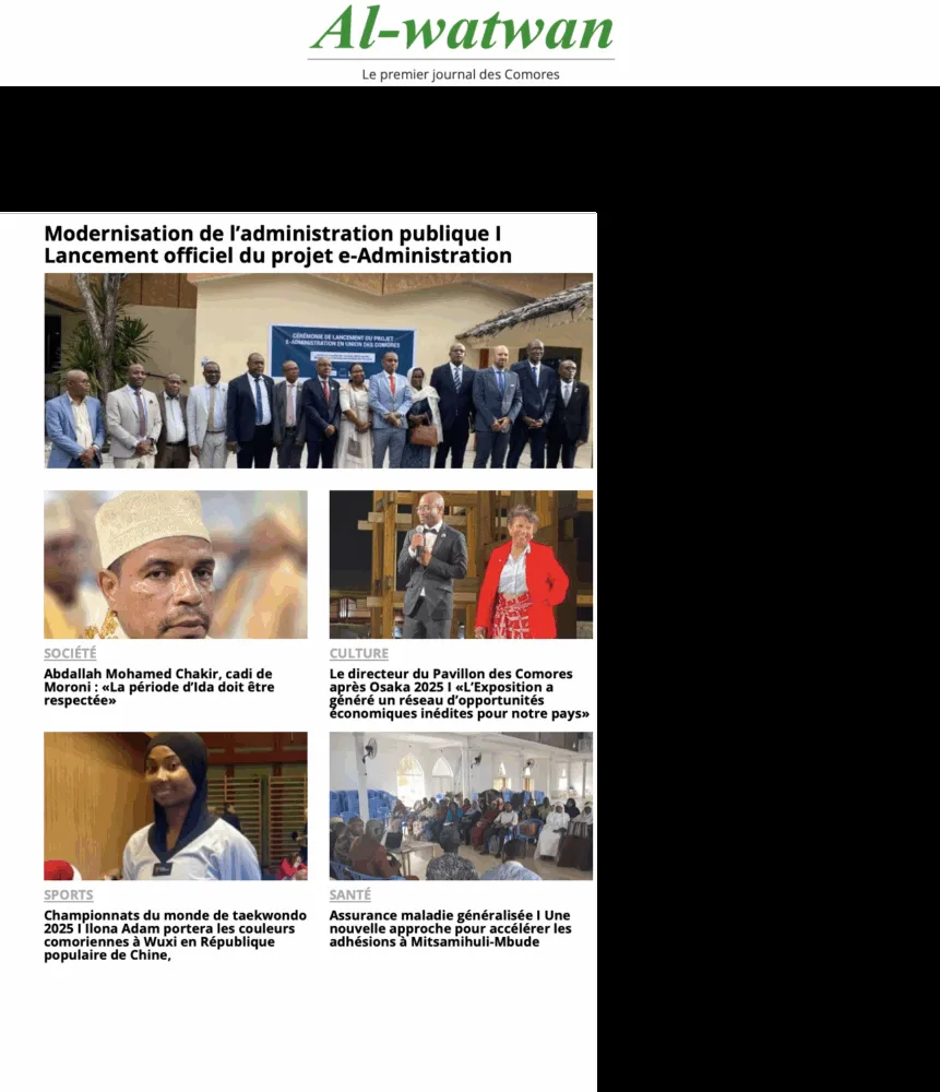 Al-Watwan salue le lancement officiel du projet e-Administration, symbole d’une modernisation nécessaire de l’État comorien. L’objectif : digitaliser les procédures pour améliorer la transparence et réduire la lenteur administrative. Le cadi de Moroni, Abdallah Mohamed Chakir, rappelle quant à lui la nécessité de respecter la période d’Ida, tandis que le directeur du pavillon comorien à Osaka souligne les retombées économiques inédites de l’exposition universelle. Sur le plan sportif, Ilona Adam représentera les Comores aux championnats du monde de taekwondo en Chine, un signal fort pour la jeunesse insulaire.