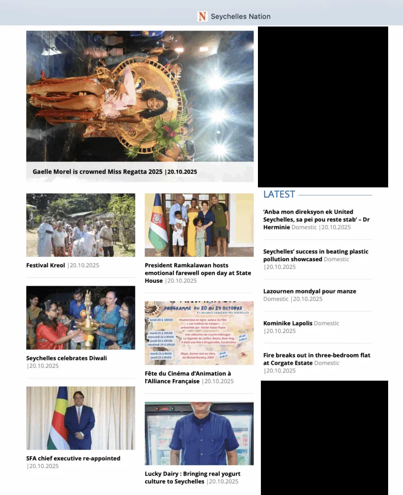 The Nation célèbre la victoire de Gaelle Morel, couronnée Miss Regatta 2025. L’archipel vit au rythme du Festival Kreol et des festivités de Diwali, dans une atmosphère d’unité. Le président Ramkalawan a organisé une journée portes ouvertes émouvante au Palais d’État. Le journal souligne aussi la réélection du directeur de la SFA et la reconnaissance des efforts du pays dans la lutte contre la pollution plastique. Entre modernité et traditions, les Seychelles affichent une sérénité rare dans la région.