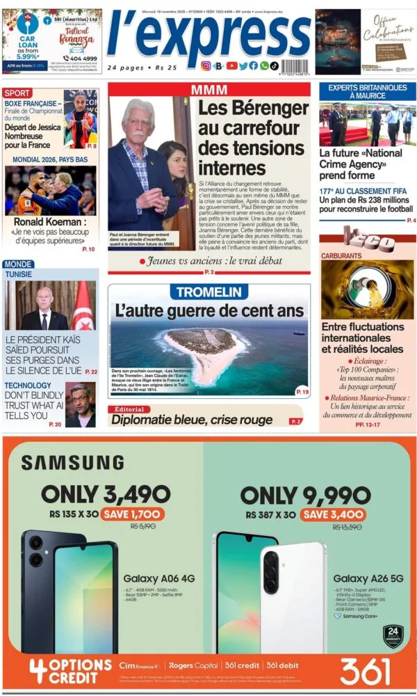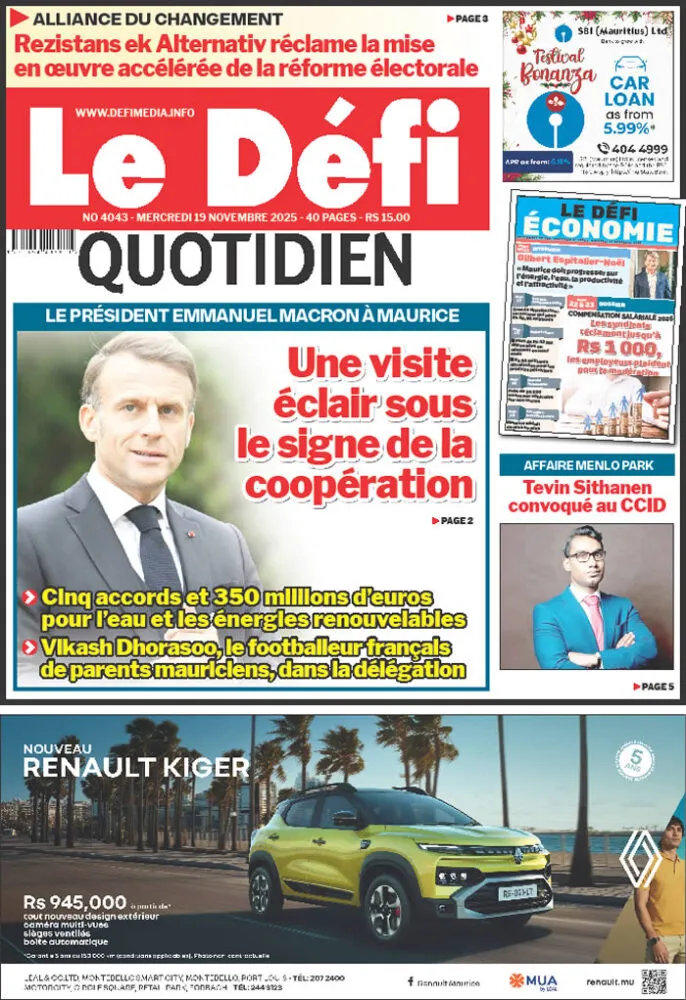 Le Défi Quotidien revient sur la visite éclair du président Emmanuel Macron, centrée sur la coopération et la signature d’accords portant notamment sur l’eau et les énergies renouvelables. L’Express de Maurice met en avant les tensions internes chez les Bérenger, alors que le MMM semble traverser un nouvel épisode de crispation. En parallèle, deux noyades ont été recensées en un jour à Balaclava et Pomponnette, suscitant des inquiétudes sur la sécurité balnéaire.