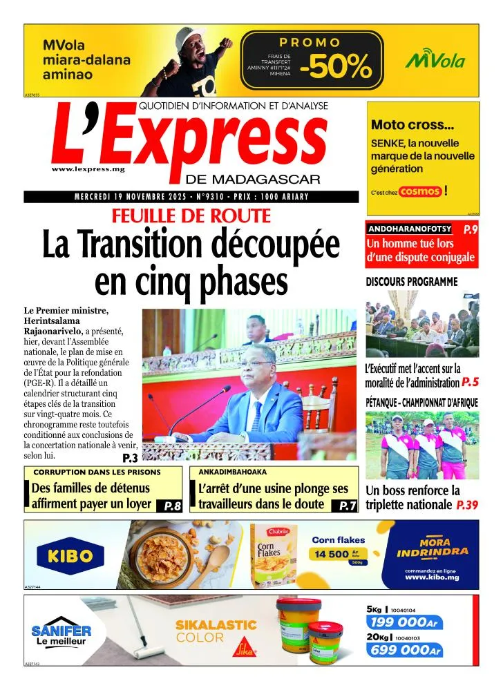 L’Express de Madagascar titre sur la feuille de route du Premier ministre Herintsalama Rajonarivelo, qui prévoit une transition en cinq phases sur vingt-quatre mois. Le quotidien relève également la colère des travailleurs d’une usine fermée à Ankadimbahoaka, plongés dans l’incertitude. Des dégâts significatifs ont aussi été signalés à Bongatsara après de fortes pluies.