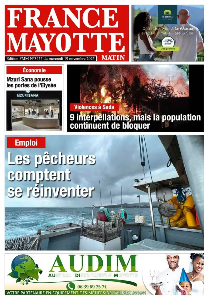 France Mayotte Matin évoque de nouvelles violences à Sada, où neuf interpellations ont eu lieu alors que la population maintient les blocages. Le journal consacre aussi sa une à la situation économique locale, avec l’enseigne Mizuri Sana désormais implantée à Paris. Un autre dossier s’intéresse à la réinvention des métiers de la pêche : les professionnels cherchent à s’adapter à un contexte en pleine mutation.