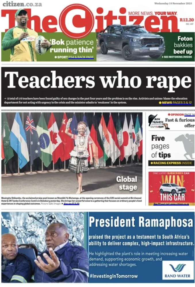 The Citizen titre sur un sujet sensible : l’augmentation des cas d’enseignants condamnés pour crimes sexuels, avec 176 dossiers recensés en quatre ans. Le journal souligne aussi les enjeux liés à la sécurité maritime, alors que les coupes budgétaires fragilisent la protection des routes commerciales et des zones de pêche. Enfin, le pays poursuit sa scène diplomatique dans le cadre du G20.