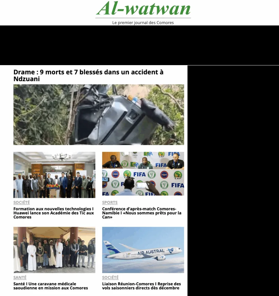 Al-Watwan met en avant les appels du président Azali Assoumani en faveur de résultats concrets dans l’action des ministères, dans un contexte de forte demande sociale. Le journal revient également sur un accident dramatique à Ndzuwani, ayant fait neuf morts et sept blessés. Par ailleurs, de nouvelles missions médicales saoudiennes sont arrivées, et la liaison Réunion–Comores reprendra en décembre avec des vols directs d’Air Austral.