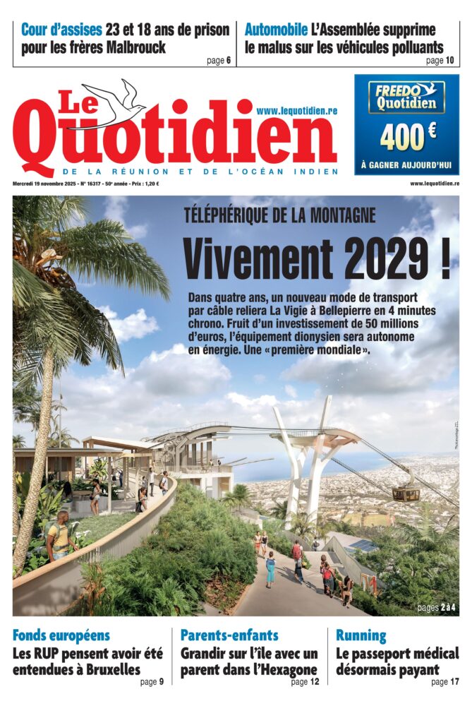 Le Quotidien met à la une le futur téléphérique urbain reliant La Vigie à Bellepierre, annoncé pour 2029. Le projet, estimé à 50 millions d’euros, devrait offrir un mode de transport rapide et autonome en énergie. Le journal revient également sur l’alerte des Régions ultrapériphériques, qui jugent avoir été entendues à Bruxelles concernant les fonds européens. Le procès Malbrouck est aussi largement couvert, avec la diffusion de vidéos choc retracées lors de l’audience.
