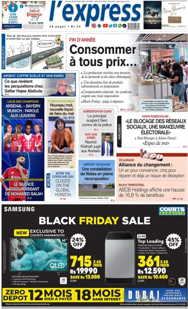 L’Express mauricien alerte pour sa part sur la hausse du coût de la vie en période de fêtes, entre pression sur la production vivrière, nouvelles listes de produits encadrés et revendications salariales.