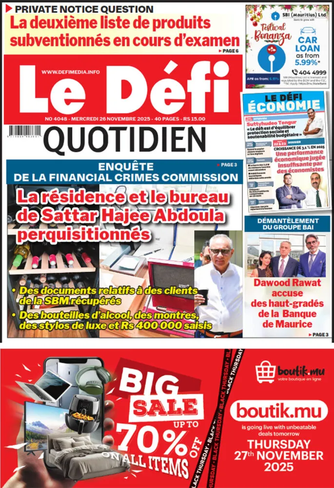 Le Défi Quotidien revient sur les ramifications de l’affaire Sattar Hajee Abdoula, dont la résidence et le bureau ont été perquisitionnés. Documents sensibles, biens de valeur et éléments financiers ont été saisis. Le journal évoque aussi la possible évolution de la liste des produits subventionnés et les enjeux budgétaires nationaux.