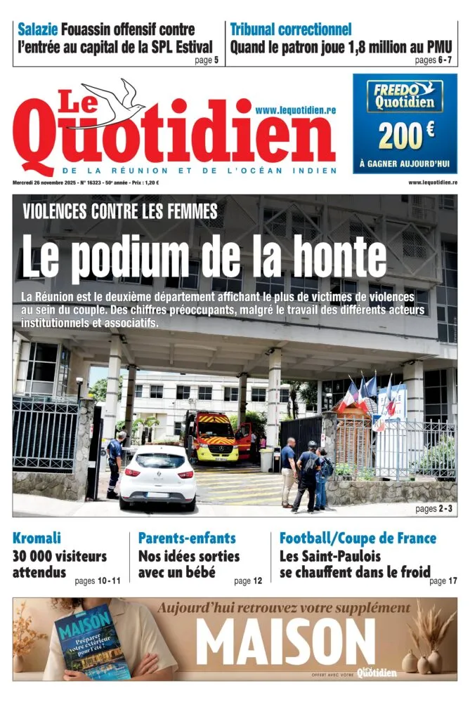 Le Quotidien titre sur « Le podium de la honte », une enquête inquiétante sur les violences faites aux femmes. Le département se classe en deuxième position nationale pour le nombre de victimes au sein du couple. Le journal souligne la persistance d’un phénomène massif malgré l’investissement d’acteurs institutionnels et associatifs.