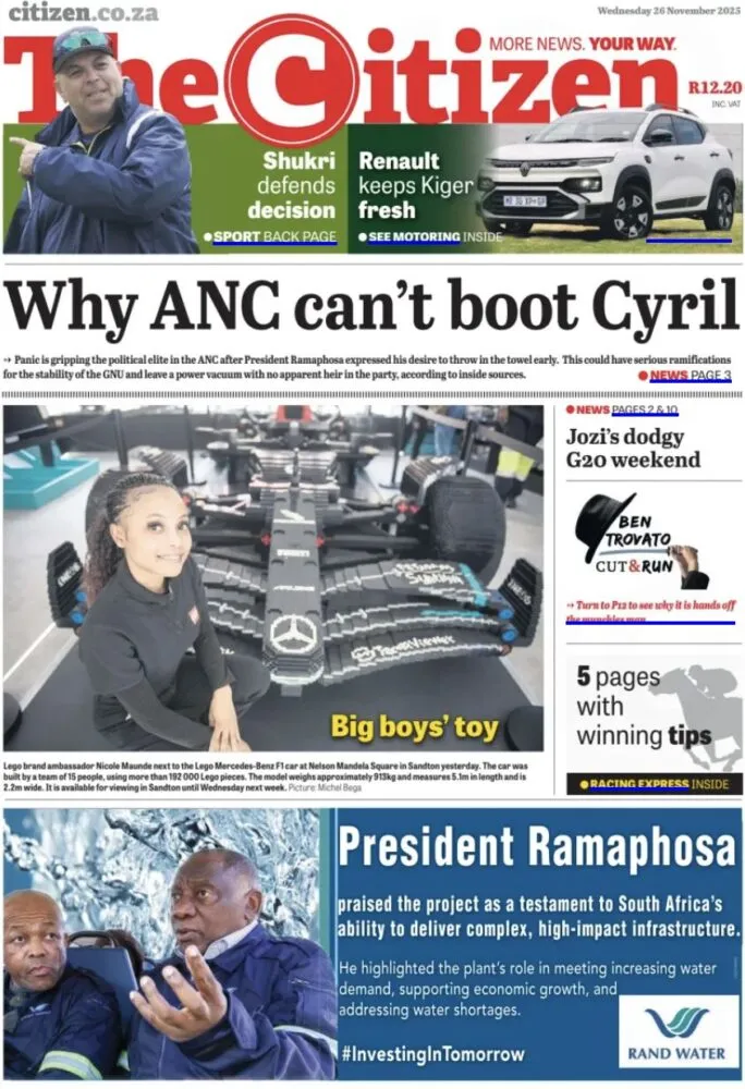 The Citizen se penche sur l’avenir politique de Cyril Ramaphosa avec un titre sans détour : « Why ANC can’t boot Cyril ». Le quotidien explique pourquoi le président reste, malgré les critiques, la clé de voûte de l’équilibre interne au sein de l’ANC, toute tentative de succession faisant planer le risque d’un vide de pouvoir. Le journal revient aussi sur le week-end du G20 à Johannesburg et les critiques visant l’organisation de l’événement.
