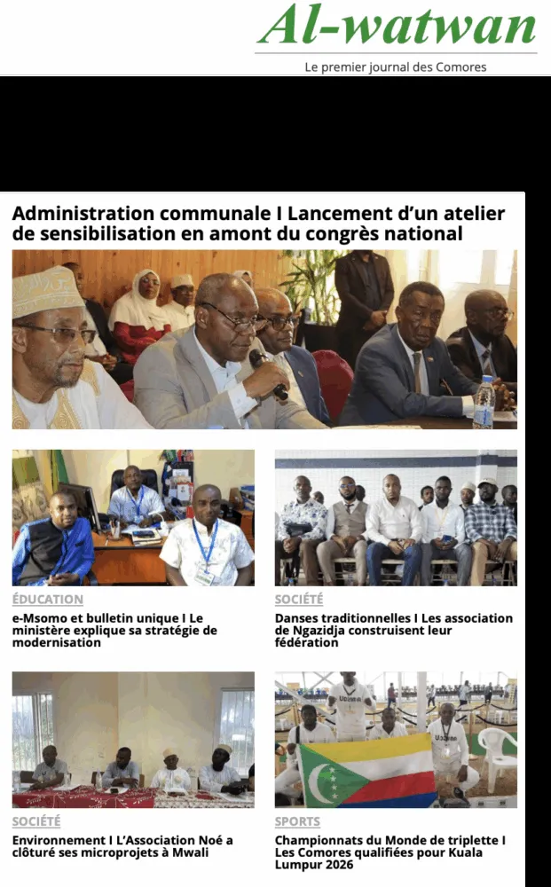 Al-Watwan ouvre sur le lancement d’un atelier de sensibilisation en amont du congrès national de l’administration communale. Le journal revient également sur les stratégies de modernisation du ministère de l’Éducation, la réorganisation des associations culturelles, les initiatives environnementales locales et la qualification des Comores pour les championnats du monde de triplette 2026.