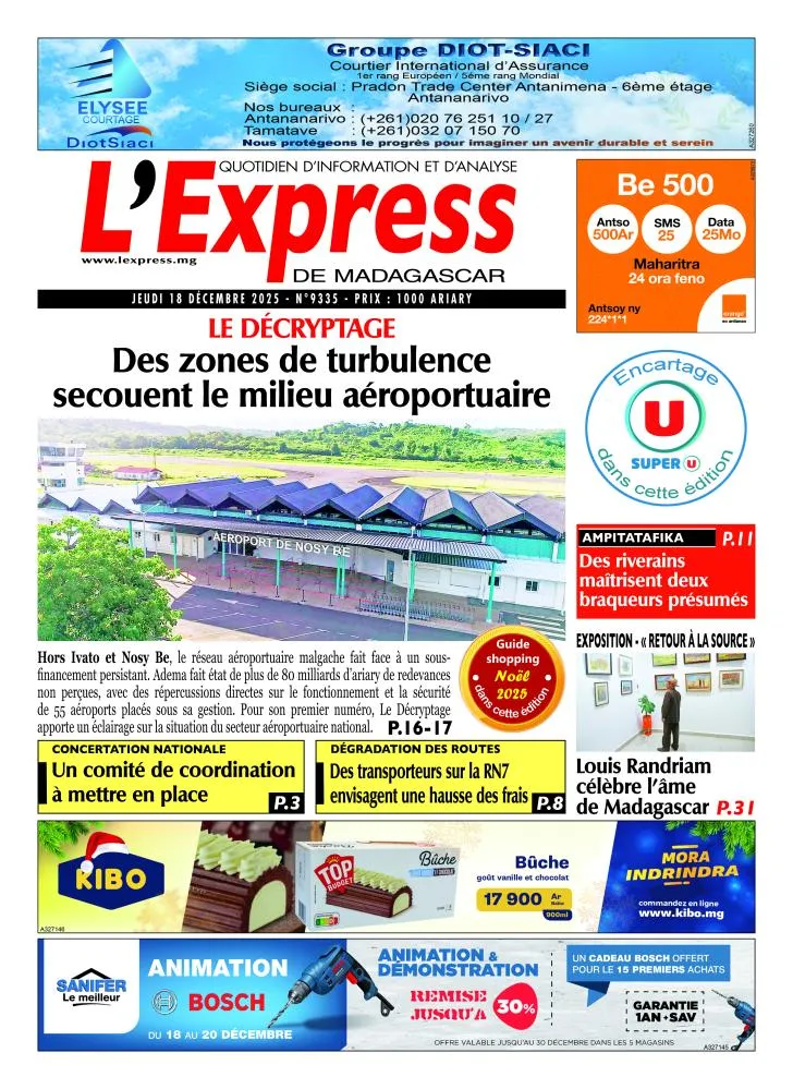 L’Express de MADAGASCAR met en une les échanges entre le gouvernement et les députés, dominés par les urgences sociales lors des séances de questions-réponses à l’Assemblée nationale. Le journal aborde aussi les premiers retours d’usagers du train urbain, les enjeux de leadership portés par la jeune Chambre internationale à Antsiranana et les inquiétudes sanitaires liées à une suspicion de dengue à Toamasina. Un autre dossier s’intéresse aux turbulences qui secouent le secteur aéroportuaire malgache, confronté à un sous-financement structurel.