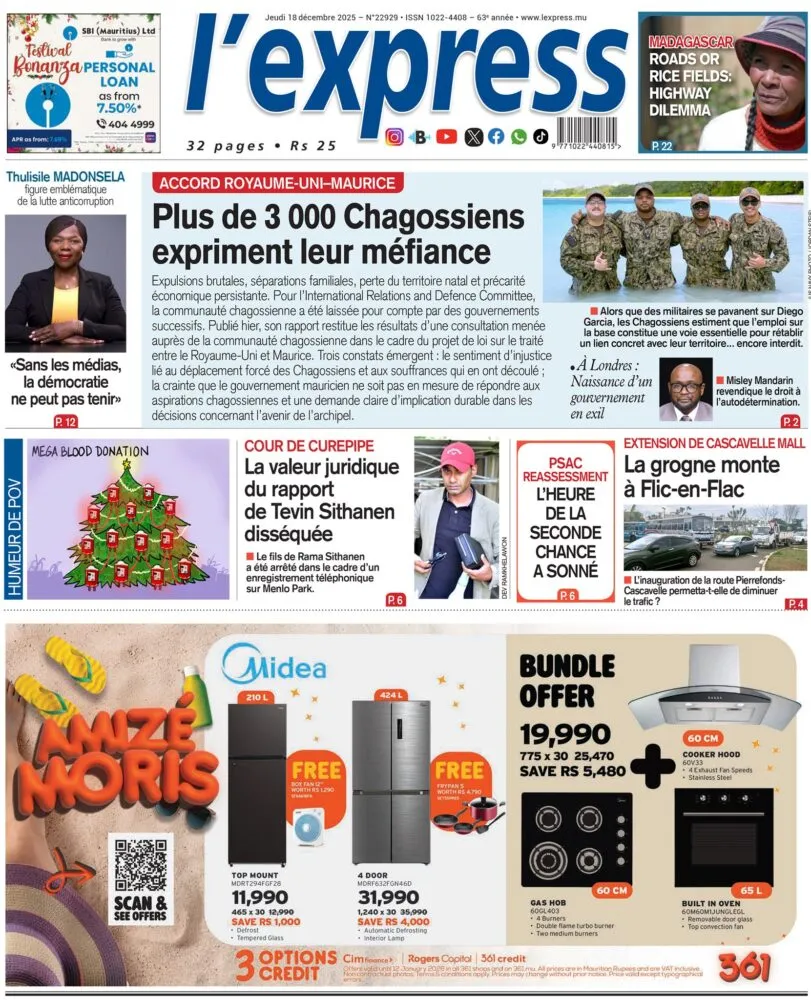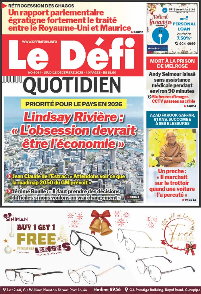L’Express revient largement sur l’accord Royaume-Uni–MAURICE concernant les Chagos, alors que plus de 3 000 Chagossiens expriment leur défiance. Le journal évoque des expulsions brutales, des séparations familiales et une précarité persistante, malgré la consultation menée par l’International Relations and Defence Committee. Le Défi Quotidien s’intéresse pour sa part au dossier Andy Selmour, avec un éclairage sur la prise en charge médicale au cœur de l’enquête, ainsi qu’aux débats autour des priorités économiques du pays à l’horizon 2026.