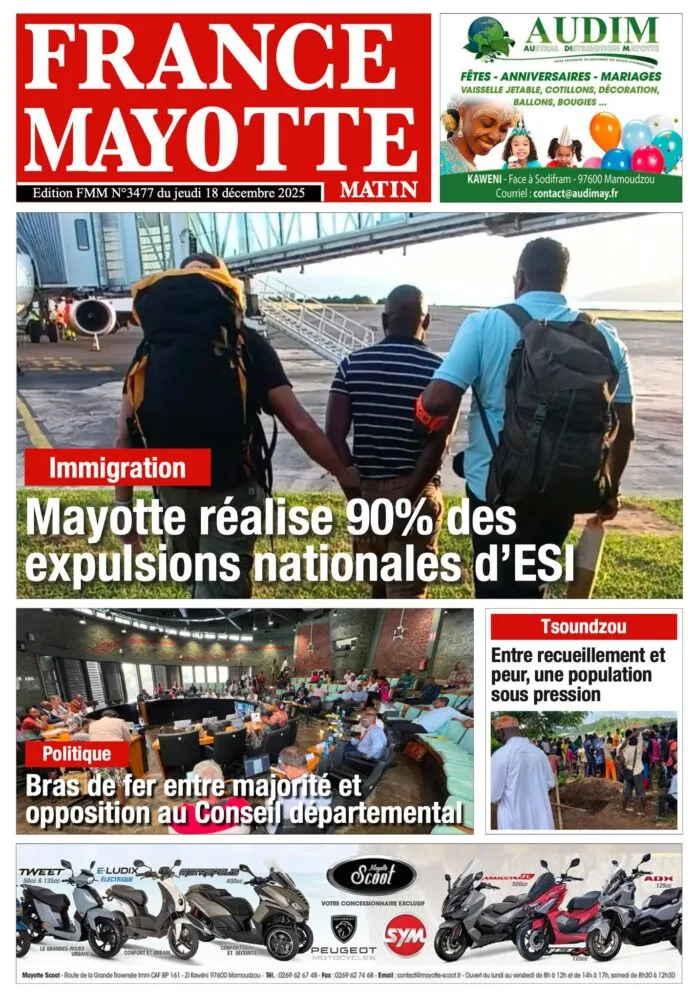 France Mayotte Matin revient sur la question migratoire, avec Mayotte qui concentre à elle seule près de 90 % des expulsions nationales d’étrangers en situation irrégulière. Le quotidien évoque aussi les tensions politiques au Conseil départemental, marquées par un bras de fer entre majorité et opposition, ainsi que les inquiétudes persistantes de la population à Tsoundzou, partagée entre peur et résignation face à l’insécurité et à la pression migratoire.