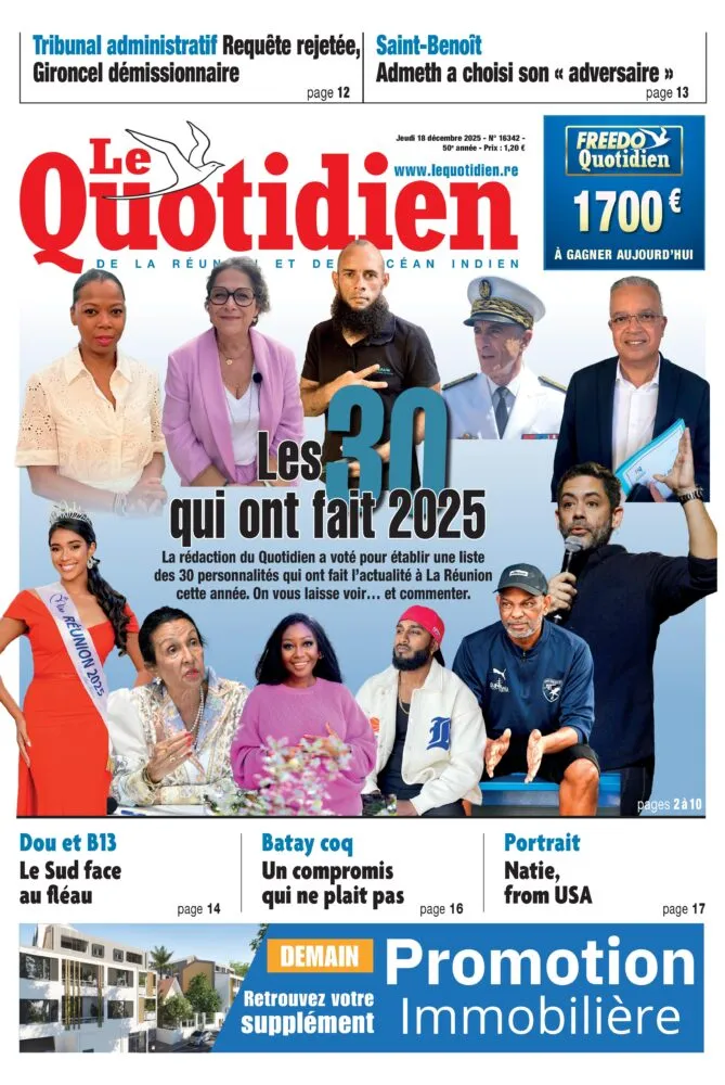 Le Quotidien consacre sa une à un exercice de l’armée de l’air française au-dessus de l’île, avec deux Mirage engagés dans une manœuvre grandeur nature à plus de 1 000 km/h. Le journal met également en avant les municipales à Saint-Louis, marquées par une volonté d’apaisement après des années de tensions, ainsi que plusieurs dossiers de société, dont le harcèlement scolaire et la prise en charge des parents âgés. En parallèle, l’édition annonce une série spéciale consacrée aux 30 personnalités qui ont marqué La Réunion en 2025.