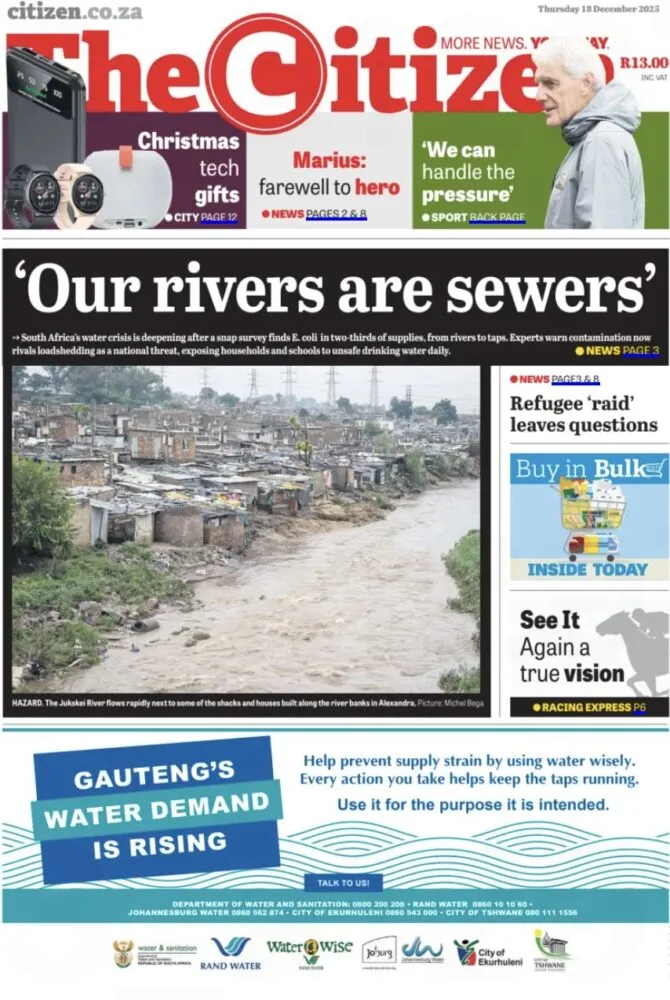 The Citizen s’inquiète de la crise de l’eau, avec des rivières qualifiées de véritables « égouts » et une contamination généralisée affectant l’approvisionnement en eau potable. Le quotidien sud-africain traite également des tensions autour du système judiciaire, de dossiers politiques sensibles et de sujets de société à l’approche des fêtes de fin d’année.