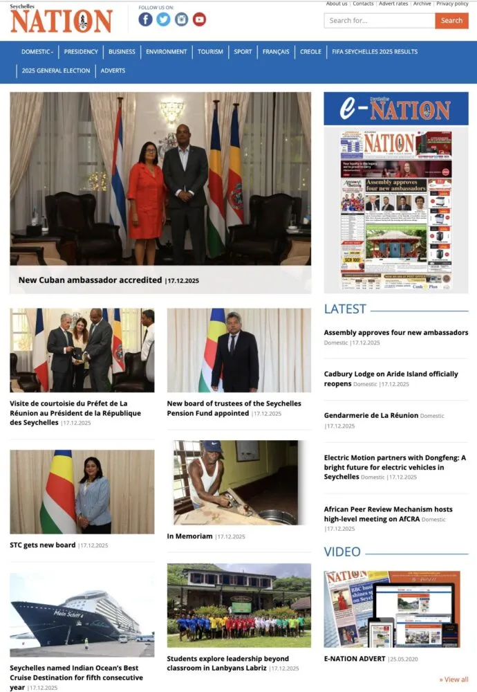 Seychelles Nation rapporte l’accréditation d’un nouvel ambassadeur cubain auprès de la République des SEYCHELLES, ainsi que l’approbation par l’Assemblée nationale de quatre nouveaux ambassadeurs. Le journal souligne aussi la reconnaissance internationale de l’archipel, à nouveau désigné meilleure destination de croisière de l’océan Indien pour la cinquième année consécutive. D’autres articles portent sur la gouvernance des fonds de pension, la protection des zones marines et plusieurs initiatives éducatives et environnementales.
