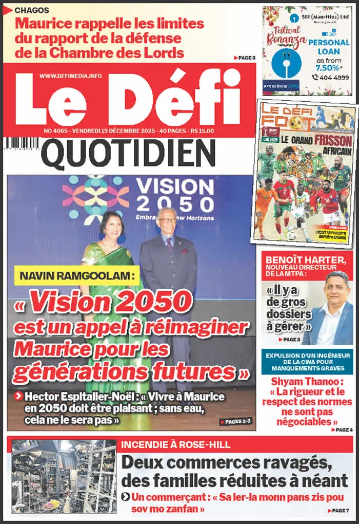 Le Défi Quotidien met en avant la vision « Vision 2050 » portée par le Premier ministre Navin Ramgoolam, qualifiée d’appel à repenser MAURICE pour les générations futures. En parallèle, le journal rapporte un incendie majeur à Rose-Hill ayant ravagé deux commerces et plongé plusieurs familles dans la détresse.