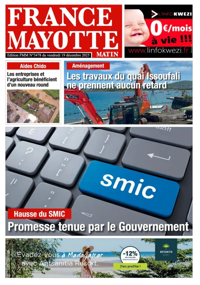 France Mayotte Matin revient sur la poursuite des travaux du quai Issoufali, annoncés sans retard, ainsi que sur un nouveau round d’aides liées à Chido pour les entreprises et le secteur agricole. Le journal évoque également la hausse du SMIC, présentée comme une promesse tenue par le gouvernement, dans un contexte social toujours sous tension.