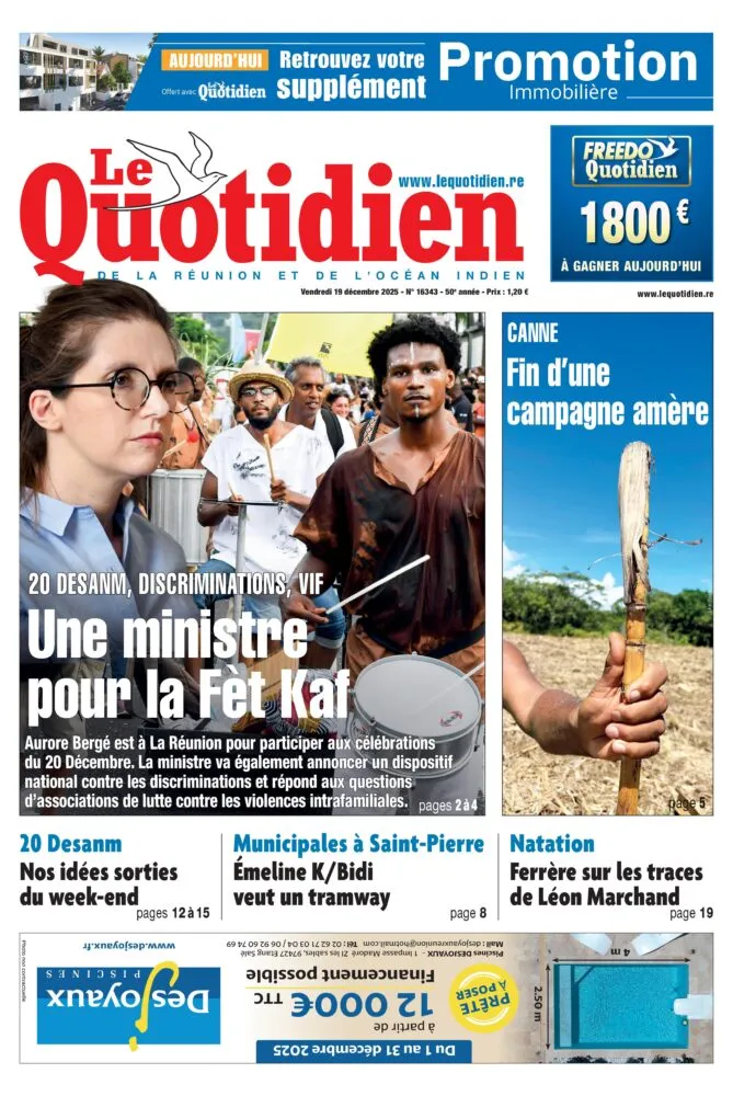 Le Quotidien consacre sa une à la venue d’Aurore Bergé à LA RÉUNION à l’occasion du 20 Desanm. La ministre déléguée participe aux célébrations tout en annonçant un dispositif national renforcé contre les discriminations. Le journal met également en avant les débats municipaux à Saint-Pierre autour du projet de tramway et plusieurs dossiers sociétaux liés aux violences intrafamiliales.