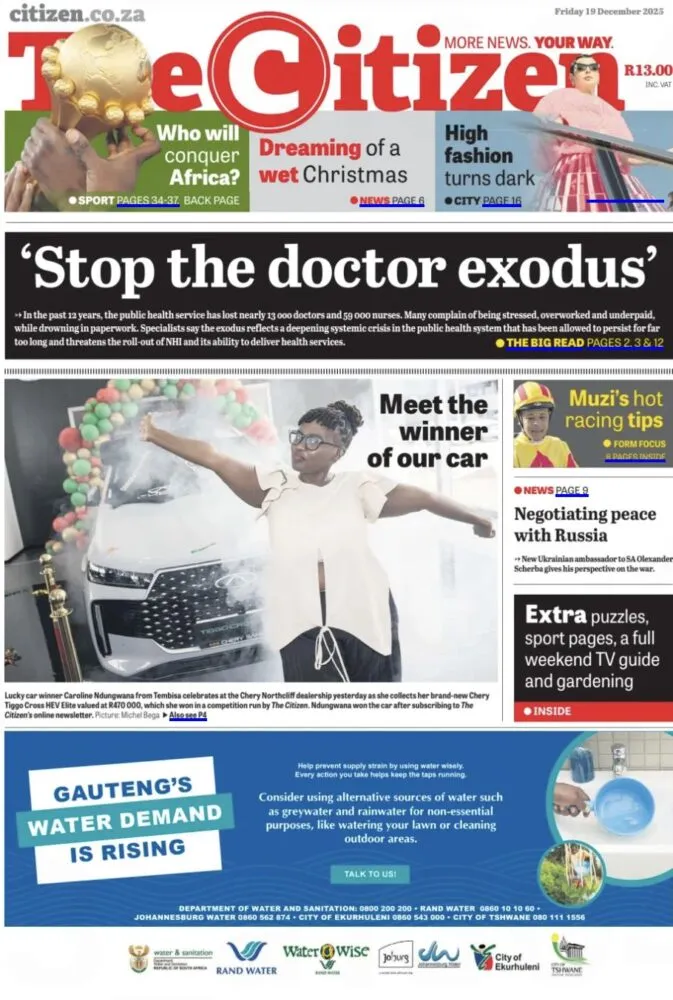 The Citizen alerte sur la crise sanitaire liée à l’exode massif des médecins et infirmiers du secteur public. Le quotidien évoque un système de santé fragilisé par le sous-effectif, la surcharge de travail et le manque de moyens, appelant à des réformes urgentes pour éviter une dégradation durable des services.