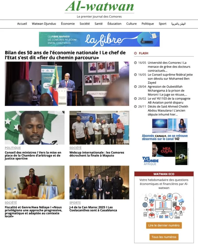Al-watwan dresse un bilan des cinquante ans de l’économie nationale, avec un chef de l’État se disant « fier du chemin parcouru ». Le journal évoque également les performances sportives des Cœlacanthes engagés à la CAN Maroc 2025 et plusieurs réformes institutionnelles en cours, notamment dans les domaines économique et judiciaire.