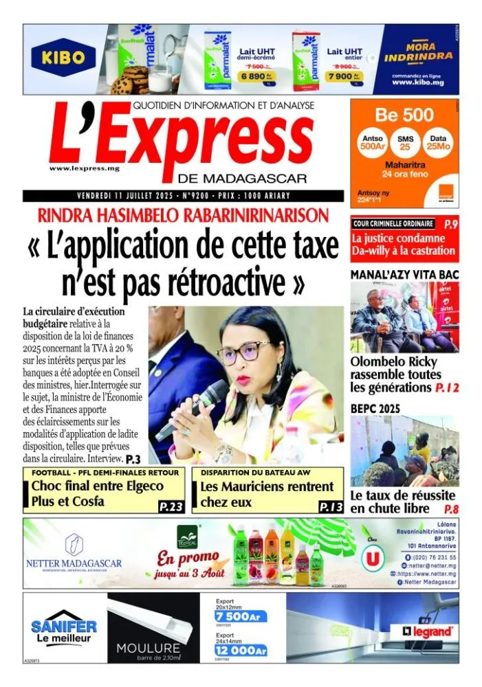 La ministre Rindra Hasimbelo Rabarinirinarison précise que la nouvelle taxe de 20 % sur les intérêts bancaires n’est pas rétroactive. Elle s’appliquera uniquement aux opérations à venir, conformément à la circulaire d’exécution budgétaire. En parallèle, le journal rapporte la condamnation de Da-willy à la castration pour crime, un fort recul du taux de réussite au BEPC 2025, et le concert intergénérationnel du chanteur Olombelo Ricky.