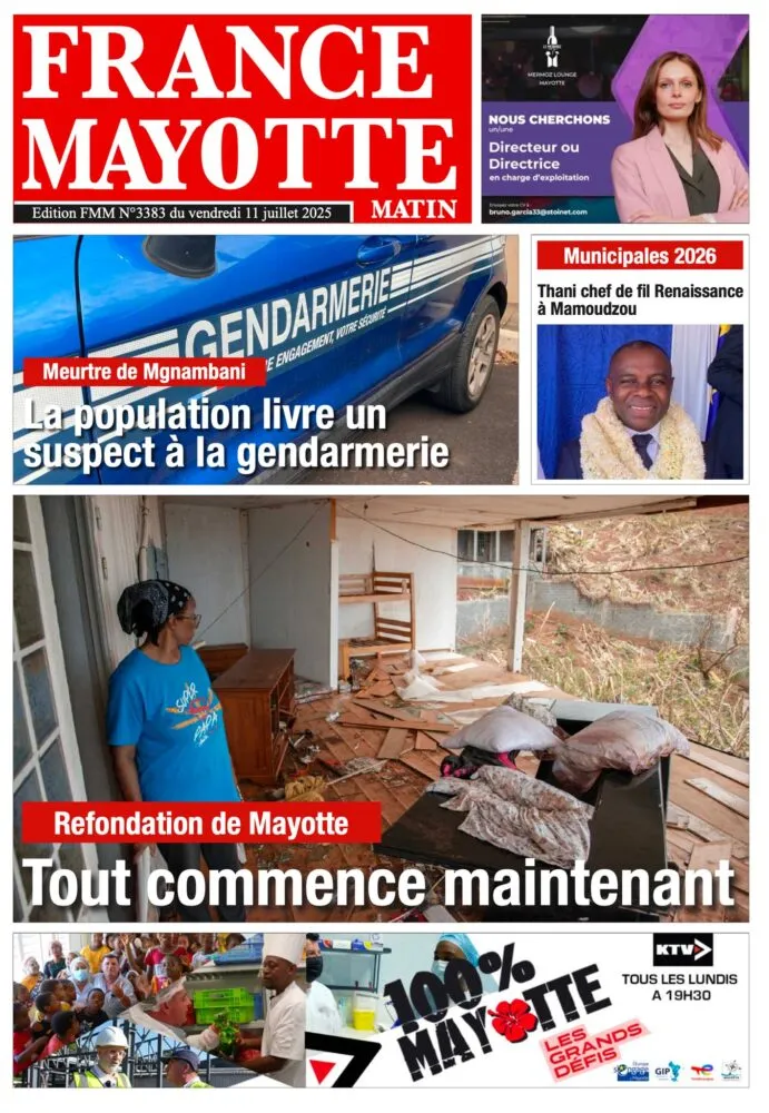 La population de Mgnambani remet un suspect à la gendarmerie après un meurtre. Thani est désigné chef de file de Renaissance à Mamoudzou en vue des municipales de 2026. Un dossier spécial est consacré à la refondation de Mayotte, avec un appel au renouveau structurel du territoire.