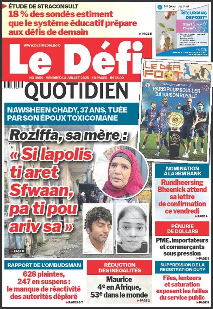 Nawsheen Chady, 37 ans, a été tuée par son mari toxicomane. Sa mère accuse la police de négligence. Le rapport de l’Ombudsman recense 628 plaintes, dont 247 non traitées, pointant l’inaction des autorités. Le journal évoque également une forte pression sur les devises et classe Maurice 4e en Afrique en termes de réduction des inégalités.