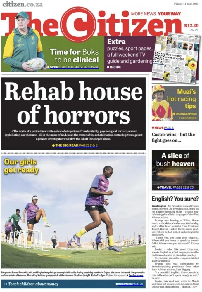 Un scandale secoue une maison de réhabilitation, qualifiée de « Rehab house of horrors ». Des accusations de torture, de violences psychologiques et d’exploitation sexuelle sont révélées après la mort suspecte d’un patient. Par ailleurs, les Banyana Banyana affûtent leur préparation en vue de leur match contre la Tanzanie, dans un entraînement relayé en une.