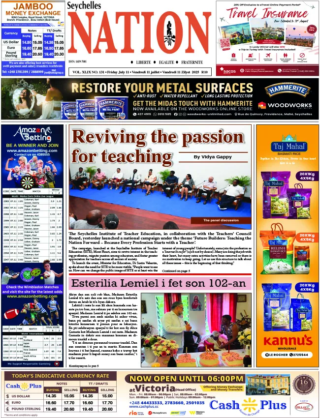 L’institut de formation des enseignants lance une campagne nationale baptisée « Reviving the passion for teaching », en collaboration avec le Teachers’ Council Board. Le journal rend aussi hommage à Esterilia Lemiel, doyenne seychelloise, qui fête ses 102 ans à Anse Boileau.