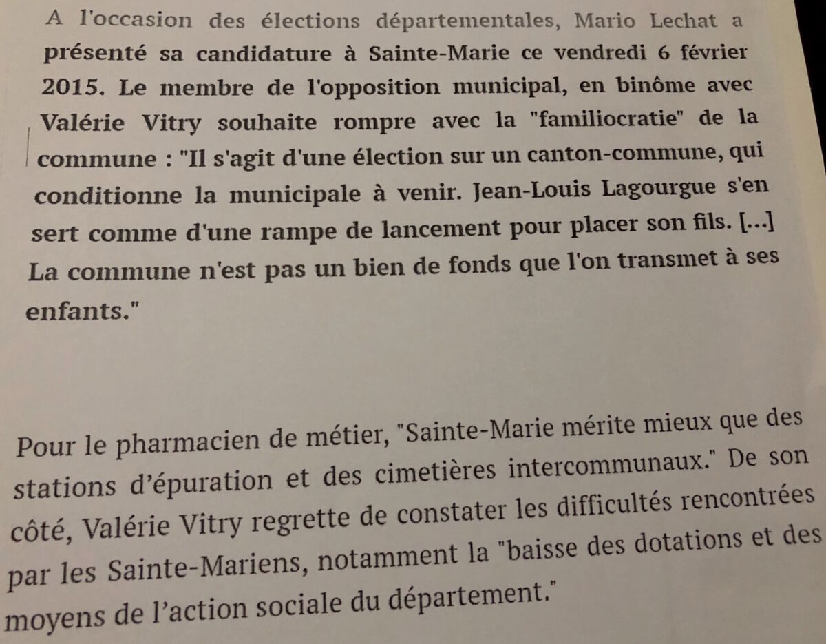 Après l’enregistrement, le maire Richard Nirlo a sorti une coupure de presse (de nos confrères d’Imaz Press). Un extrait d’article datant de la campagne électorale des départementales de 2015 lors desquelles Valérie Vitry-Rivière, binôme à l’époque de Mario Lechat, adversaire politique des Lagourgue. Lisez çi-dessous ce que disait Valérie Rivière des Lagourgue père et fils :