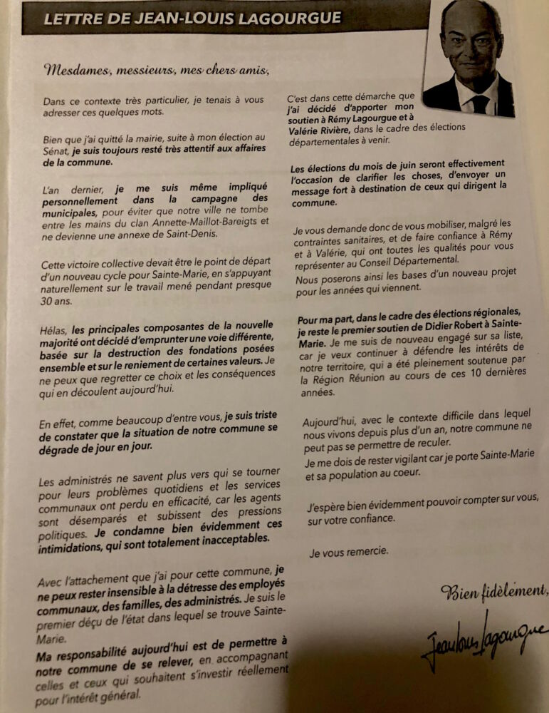 « J’étais maire par intérim de 2018-2020. J’ai mené la mission qui m’avait été confiée par l’ancien maire avec respect et responsabilité. Arrivé à la fin de ce mandat, nous avons prépare les municipales de 2020. Pour le choix du candidat, Rémy s’est imposé à son père et le père a imposé son fils. Lors d’une réunion aux « Citronnelles », j’ai validé la candidature de Rémy Lagourgue. J’ai pris la parole pour demander à la majorité municipale d’accompagner Rémy aux élections municipales de 2020. Didier Robert et Cyrille Melchior étaient présents lors de cette réunion. Peu de temps après, Rémy m’appelle : « Richard est-ce qu’on peut se rencontrer ? ». Il me dit : « aujourd’hui, suis conseiller départemental, j’ai la délégation Patrimoine ainsi que ma petite entreprise…. Avec la crise des Gilets Jaunes et en raison de ma filiation, j’ai bien réfléchi, je pense que ce n’est pas le moment pour moi. C’est toi qui devrait y aller. Rémy me demande de réfléchir… Depuis 1990, je suis engagé aux côtés de Jean-Louis Lagourgue. Je lui ai toujours été fidèle, loyal…. J’ai pris un moment de réflexion, j’en ai partagé avec ma famille. Et j’ai décidé alors de relever le défi. Ce n’était pas facile. Il y avait Christian Annette, Céline Sitouze, Grégoire Cordebœuf. Puis, le cador envoyé par St-Denis : Gérald Maillot. Il fallait défendre les couleurs de Sainte-Marie. C’est là que j’ai décidé de mettre en place cette équipe qui m’accompagne aujourd’hui. St-Denis a toujours lorgné sur Ste-Marie. Je décide d’aller au combat avec l’aval de Jean-Louis Lagourgue et de son fils Rémy. Nous avons mené ensemble une belle campagne dans un contexte particulier en raison de la crise sanitaire. Nous avons malgré tout réussi à créer une elle dynamique et nous avons gagné au second tour, le 28 juin 2020. Beaucoup ne s’attendaient pas à cette victoire. Pas même les Lagourgue », avoue aujourd’hui Richard Nirlo. Avant de s’interroger à haute voix : « Pourquoi Rémy a décidé de ne pas venir ? ». Puis de répondre : « je vais vous le dire. Rappelez-vous : Jean-Louis Lagourgue me passe les rênes, il ne s’attendait pas à ce que la population me fasse confiance, à ce que je sois élu avec mon équipe. Et qu’est-ce qui me tombe dessus dans la foulée ? Perquisitions à la mairie, 2 gardes à vue, 18 observations de la Chambre régionale des comptes , sans compter 11 autres concernant uniquement le CCAS. L’ex maire s’est assis dessus. Ces observations remontaient à 2013. Elles ne me concernaient pas. Vous avez maintenant la réponse pour comprendre le refus de Rémy Lagourgue de ne pas se présenter aux municipales de 2020. Parce qu’il n’a pas eu le courage de porter l’héritage de son père.